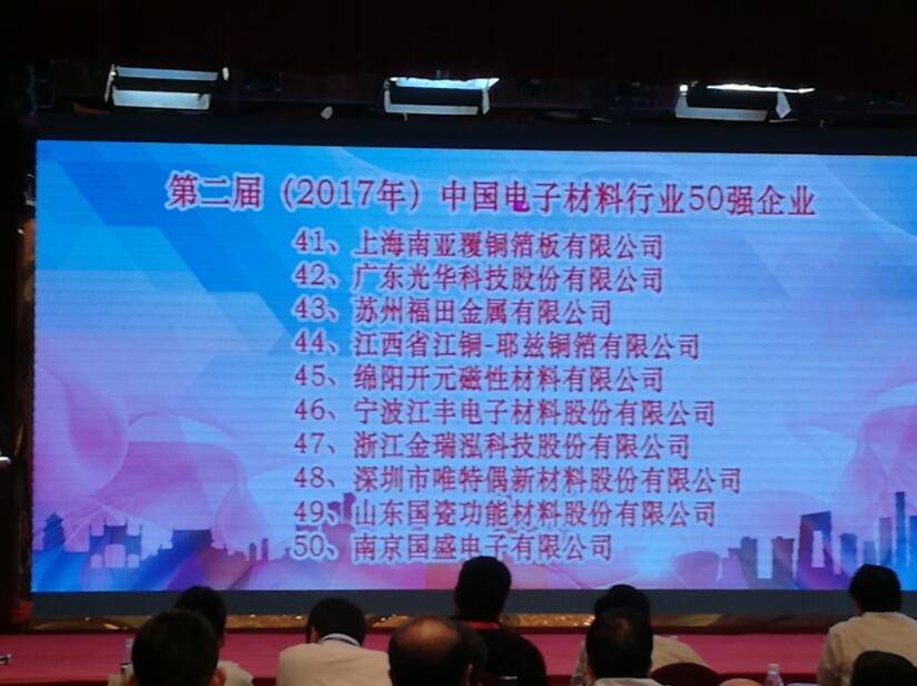 大會重磅發布了第二屆(2017年)中國電子材料五十強企業,以及相關電子材料專業十強企業名單。光華科技憑借在專用電子化學品領域的突出表現,光榮入選中國電子材料五十強,并被評為電子化工材料十強企業!